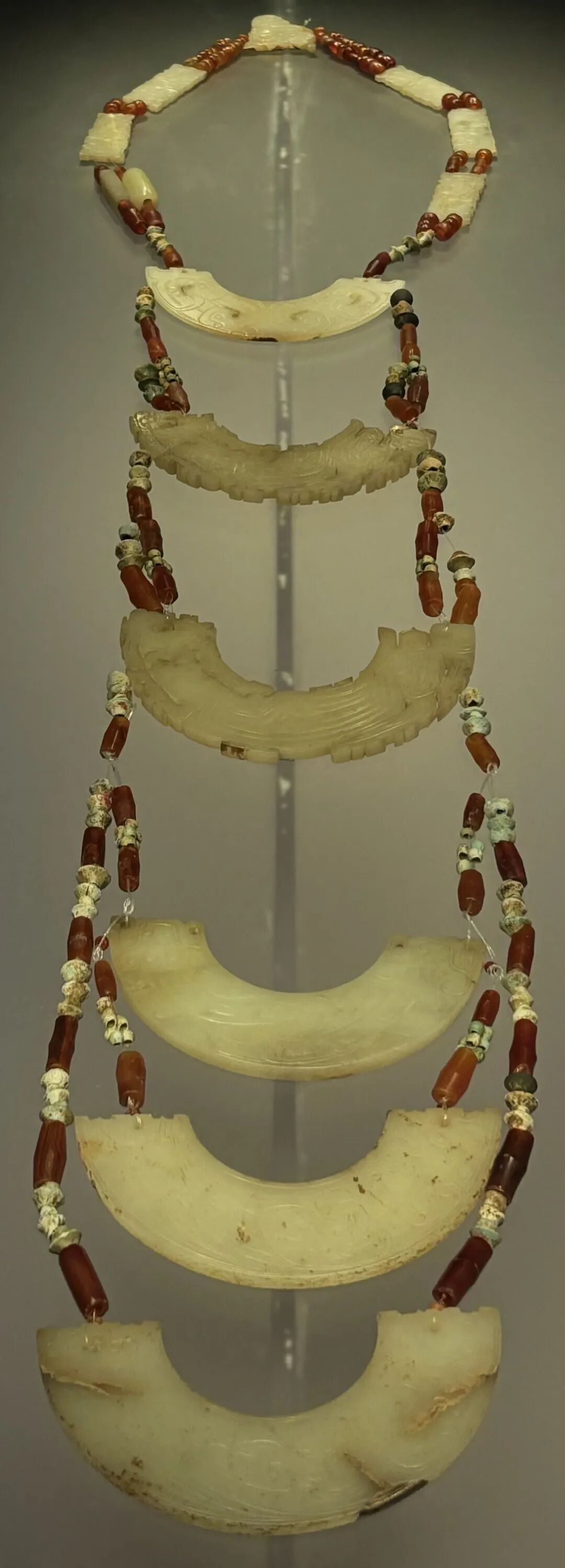 古时,三门峡被称为虢(guó)国。走进虢国博物馆,可以看到镇馆之宝——六璜联珠组玉佩,由六件玉璜及数百颗玛瑙珠、料珠连缀而成,华美至极。其中两件玉璜纹理可拼合成璧,印证了“半壁为璜”的古老说法。